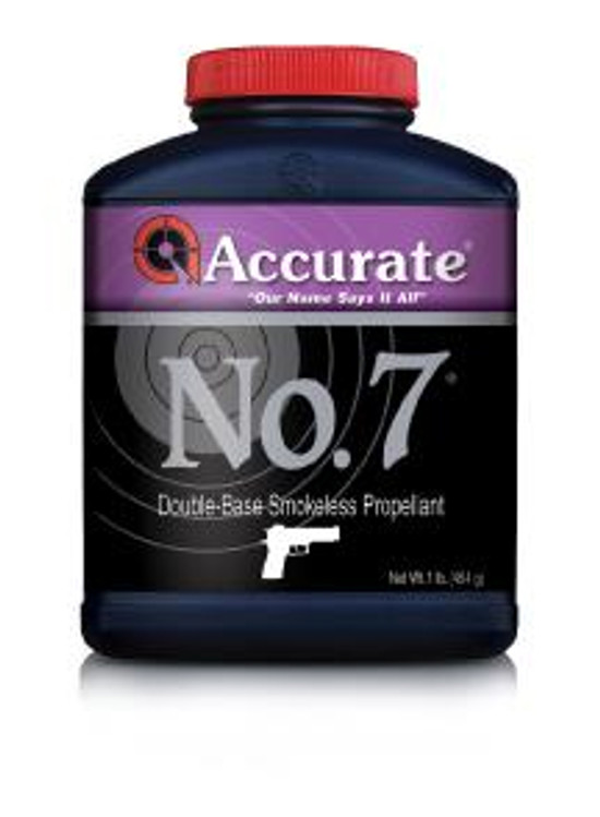Accurate No. 7 is an intermediate burning, double-base, spherical powder suitable for a wide range of handgun calibers. No. 7 is an excellent choice for high performance semi-auto handguns such as the 357 Sig, 38 Super, and 40 S&W. No. 7 is also a cost effective solution in larger magnum handgun calibers. Made in the USA.