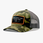 This fishing trucker hat, featuring a green camo colorway, is part of the Guide Sayings Collection. It's made from recycled poly mesh fabric built to last wear after wear. Never leaving fish to find fish is a testament to staying the course despite the possibility of finding something better elsewhere. Here's to tight lines and learning more lessons with a rod and reel in hand.