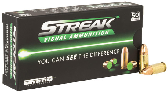 Streak Visual Ammunition features an exclusive patented technology that allows the shooter to visually see the projectiles path toward its target. Streak rounds do not generate heat so they are safe to use in environments where tracers are prohibited and can become a serious fire hazard. The results are game-changing in many aspects for the consumer, law enforcement, and military. For indoor range use and low light shooting. Specifications: 9mm/124 gr/Total Metal Case (TMC)/50 Per Box/20 Cs