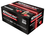 Streak Visual Ammunition features an exclusive patented technology that allows the shooter to visually see the projectiles path toward its target. Streak rounds do not generate heat so they are safe to use in environments where tracers are prohibited and can become a serious fire hazard. The results are game-changing in many aspects for the consumer, law enforcement, and military. For indoor range use and low light shooting.