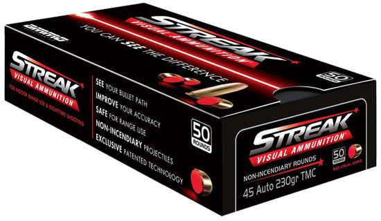 Streak Visual Ammunition features an exclusive patented technology that allows the shooter to visually see the projectiles path toward its target. Streak rounds do not generate heat so they are safe to use in environments where tracers are prohibited and can become a serious fire hazard. The results are game-changing in many aspects for the consumer, law enforcement, and military. For indoor range use and low light shooting.
