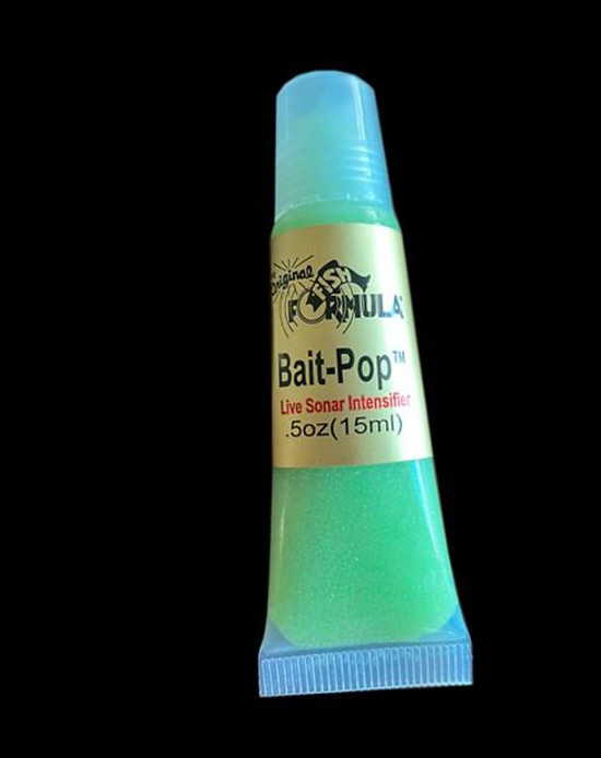 Patented Bass Formula Bait Pop. Enhance your bait on Live Sonar. Available in many colors. This product has taken the industry by storm. The scented bass bait pop with an active ingredient that will enhance your ability to see bait or line on live sonar. Apply to your bait or line and you will love the results.