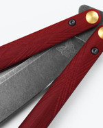 Introducing the 99 Necron™, a high-performance butterfly knife with a focus on flipping, available in two highly customizable variants that pay homage to Benchmade's roots with a return to our Bali-Song's classic form with added bonus features. Optimized for expert flippers with latchless G10 handles and a CPM-S30V Scimitar blade, fine tune the Necron™'s balance and speed with adjustable tungsten weights and extendable handles for your perfect flip and desired feel. Available with Jade or Ruby Red G10 handles, and with a trainer variant for mastering your technique, the Necron™ is finished off with a hollow diamond texture found on the safe handle to give the user a tactile indication of which handle to grasp to avoid a sharp bite.