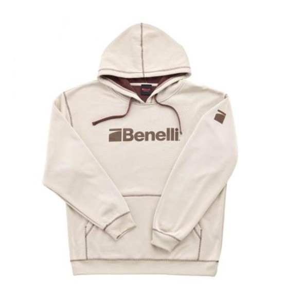Description: Heavyweight Logo Hoodie, Sand Dune. Woven of quality polyester fabric with a Sand Dune tan color, this heavy-weight hoodie features a traditional front pocket. Displayed on the front of this outerwear is the Benelli logo in brown and the sleeve features a small Benelli logo near the shoulder. The hoodie comes in 5 different sizes - small, medium, large, XL, and XXL. This comfortable and slick apparel is perfect for cool and cold weather while showcasing your pride in the Benelli image.