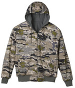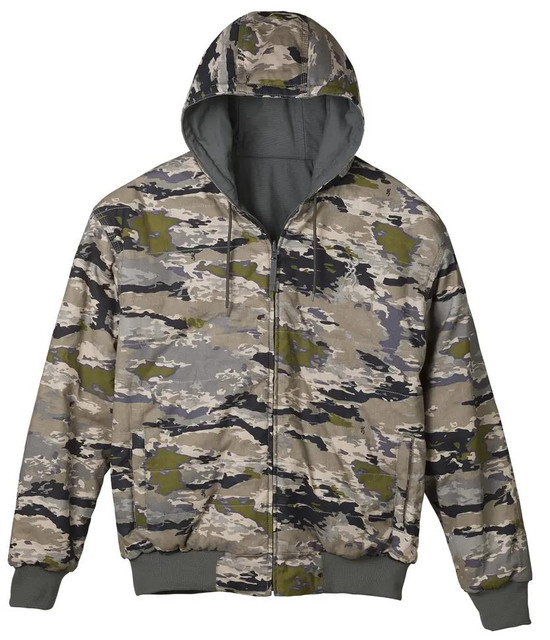 Tough enough for both the field and the job site, the Reversible Utility Jacket features a proven combination of durable fabric, heavy-duty construction, 120 grams of warm insulation, and work wear style. The full cut design provides freedom of movement and a comfortable fit. Going from the woods to town? Just reverse from camo to solid -- or don't because this jacket looks great everywhere. Both sides have handwarmer pockets. Elastic rib knit cuffs and waist, and the adjustable hood seal in warmth and keep out cold.