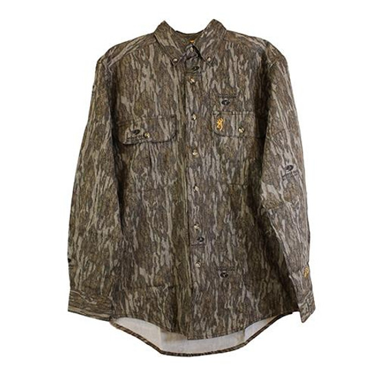 Browning Wasatch Camo Button up, long sleeve shirt. Available in Mossy Oak Bottomland Camo.
