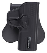 Right-handed only. Specially designed Quick-Draw safety locking mechanism. Paddle includes comfort wear silicone lining for extra comfort. Fully adjustable draw angle (tool included). Gun specific design. Suitable for civilian, duty and military use. Includes holster, paddle, attachment and adjustment tool. Black only. Polymer construction.