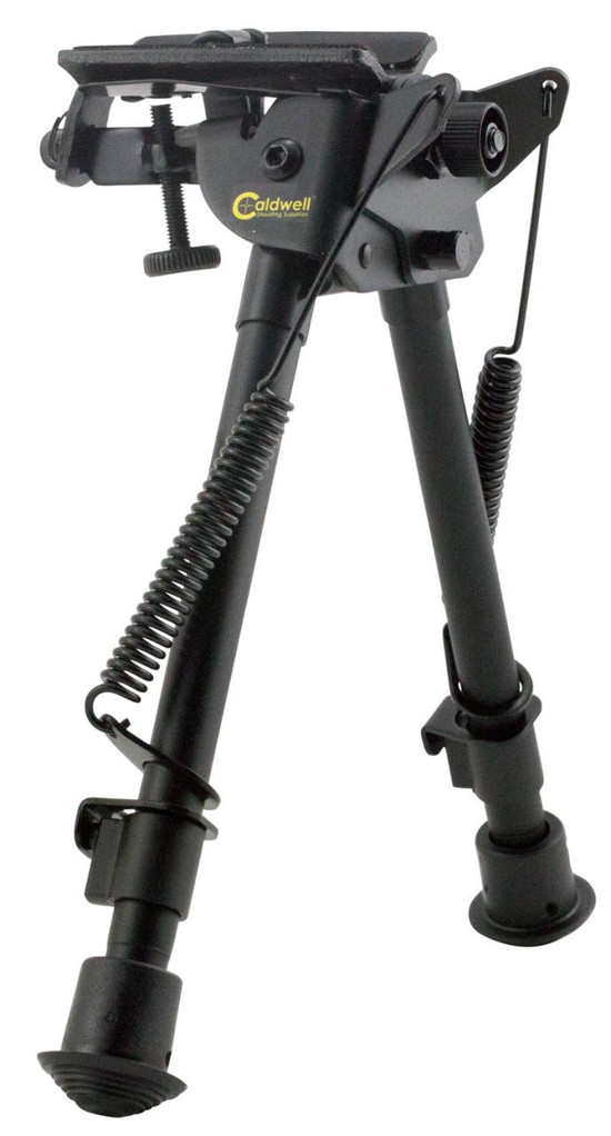 Lightweight aluminum design. Legs are notched for easy indexing to a specific height. Shooter can compensate for ground that is unlevel by up to 20 degrees. Lower portion of the bipod pivots independently from the upper stock mount allowing the firearm to be quickly leveled on uneven ground. Tension knob can be adjusted to control the resistance of the pivoting motion.