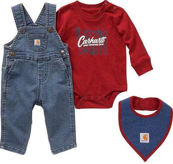 Start him off right with this total Carhartt set for baby boys. Rugged is our first name, but soft and comfy is our middle name. This outfit is both. Stretchy denim overalls goes perfectly with the cotton onesie. The handkerchief bib keeps it all looking fresh. Because drool happens.
