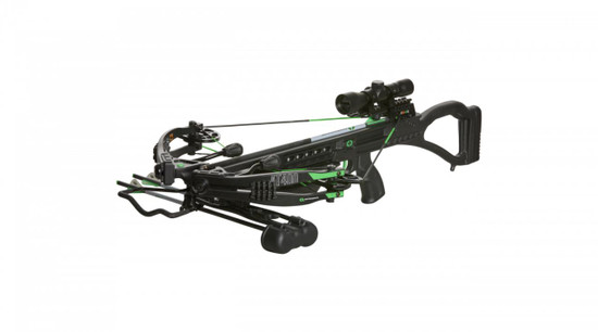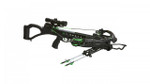 Includes a detachable silent crank, adjustable ergonomic foregrip, 4x32mm scope, oversized stirrup, and three (3) 20-inch .003 carbon arrows and quiver