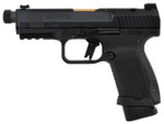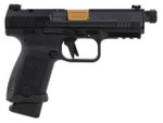 Based on the 2019 TP9 Elite Combat utilizing performance upgrades designed by Salient Arms International, the Executive features a distinctive gold barrel by Salient, fluted, match-grade, and PVD-over-nitride coated, and a black polymer frame topped with a nitride-coated jet black slide. The Executive is suppressor ready with 1/2 x 28 RH threads.