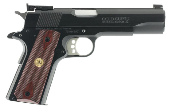 The Colt Gold Cup is known as the finest shooting semi-automatic in the world and is the standard for competitive guns. Colt Gold Cup pistols have been used to compete in local club matches through the National Matches at Camp Perry. It features an adjustable wide trigger; National Match barrel; adjustable target sights, and many other refinements as standard. Includes one magazine.