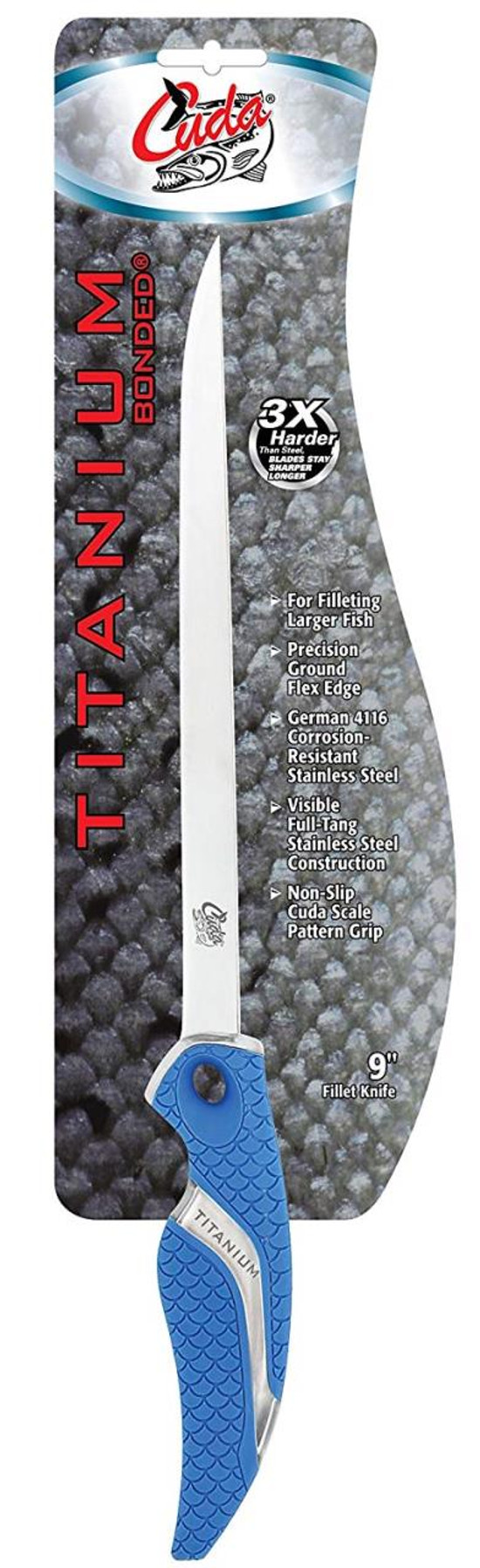 The Cuda 9" Fillet Knife features a precision edge, flexible blade. The full tang construction is visible through the Cuda scale pattern, non-slip handle. Blade is German 4116 corrosion resistant stainless steel and is Titanium Bonded so it stays sharper for a longer period of time.