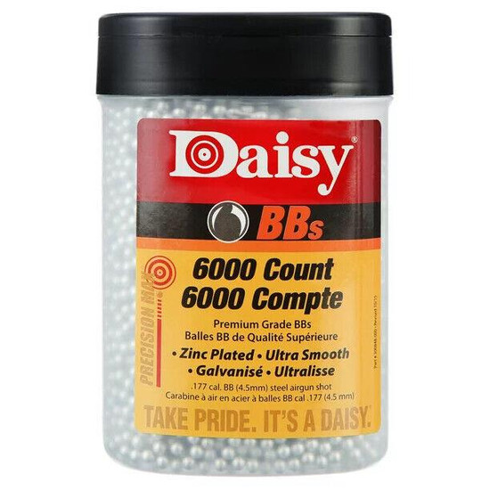 The standard in BB gun ammunition is Daisy's PrecisionMax premium BBs. Solid steel balls are zinc plated for extra smoothness. Bottles feature flip-top cap with large and small punch-out openings to make pouring BBs easy. 6000 count