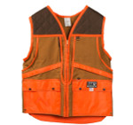 Ideal for Bird Hunters. Made with soft cotton duck fabric and outlined with orange nylon trim and pockets. With pads and pleated shoulders for unrestricted shooting. Front and side loading game bag is easily accessible. Made in U.S.A.