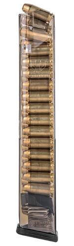 ETS magazines are made from advanced polymers that provide extreme impact resistance so they won t crack or break when dropped. With superior heat, cold, and UV resistance, these magazines won't become brittle over time, even when exposed to harsh environments, chemicals, or extreme cold. Its durable construction eliminates creep so the feed lips and body won't spread when being stored long term, even when fully loaded. ETS magazines for Glock pistols features a translucent body allowing you to see your ammo count. This model has a 30-round 40 S&W capacity and is compatible with Glock 22/23/27 (Gen 1-4).