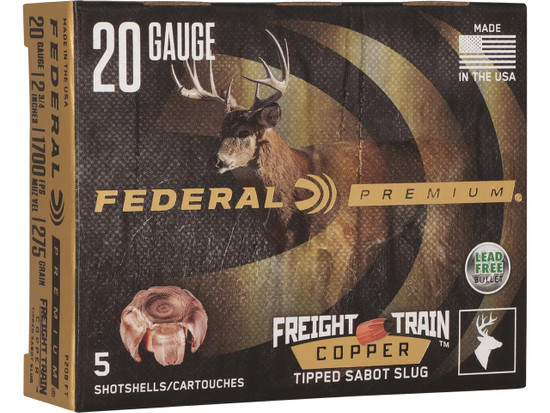 Slug accuracy and power are thundering down the tracks with the Federal Premium® FreightTrain™ copper sabot. The load's streamlined copper projectile and exclusive sabot design team up to print groups of less than 4 inches at 200 yards through rifled barrels. A polymer tip and aerodynamic nose profile maximize downrange energy, while the externally skived nose cavity provides dramatic expansion to drop buck, bears or boars where they stand.