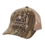 Description: Duck Logo Hat, Bottomland. Constructed with a tan mesh backing for breathability, this structured six-paneled hat features a Mossy Oak Bottomland camouflage pattern on the front along with an embroidered duck silhouette Franchi logo in tan letters. The cap has an adjustable snap closure making it one size fits most. Made from 60% cotton and 40% polyester. Show off your Franchi pride with this stylish duck patch hat.