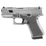 GLOCK, Hoth 43X, Striker Fired, Semi-automatic, Polymer Frame, Sub-Compact, 9MM, 3.41" Barrel, Custom Distressed Grey Cerakote Finish by Shark Coast Tactical, Fixed Sights, Shark Coast Tactical Greasy Cut Slide, Laser Stippled Grip, 10 Rounds, 2 Magazines, Will Only Accept Shield RMSC, Sig RomeoZero and Holosun 407k/507k Footprint Optics, Must Use Included Screws From Shark Coast Tactical To Mount Optic