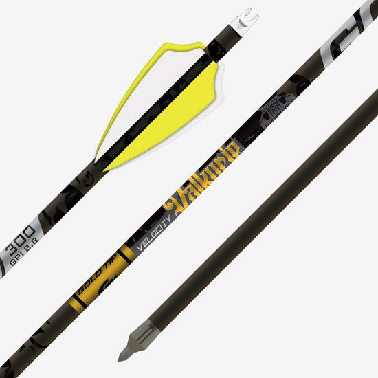Velocity Valkyrie is screaming speed with Factory Four Fletch accuracy. The Valkyrie comes Factory Four Fletched with four low-profile vanes for added surface area without sacrificing clearance or speed. That means more back-end stability, faster stabilization, and group size reductions of 20-75% with broadheads. Add to that Gold Tip's Smart Carbon® Technology for unmatched straightness retention and toughness and you get the Valkyrie.