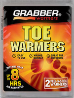Grabber Toe Warmers are single-use, air-activated heat packs that provide up to 8 hours of continuous warmth for the toes.