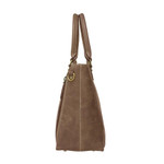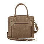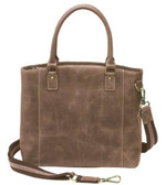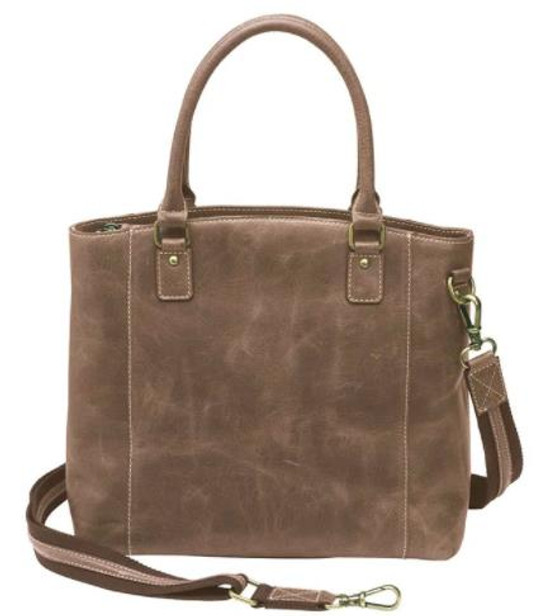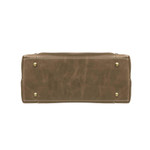 - Antiqued brass color metal hardware and top entry zipper