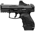 The VP9SK has all of the sought-after characteristics of larger frame VP pistols but in a more concealable design. It has a short, light take-up with a solid, single action type break followed by a short positive reset. All controls are completely ambidextrous. Slide releases are present on both sides of the frame and the paddle style magazine release can be easily activated. HK's cold hammer-forged barrel made from cannon grade steel with a polygonal bore profile, molded finger grooves, an extended Picatinny MIL-STD-1913 rail molded into its polymer frame for mounting lights and accessories. Slide releases are present on both sides of the frame and the paddle style magazine release can be easily activated. Includes two magazines, two additional backstraps and two additional sets of lateral grip plates and Holosun SCS.
