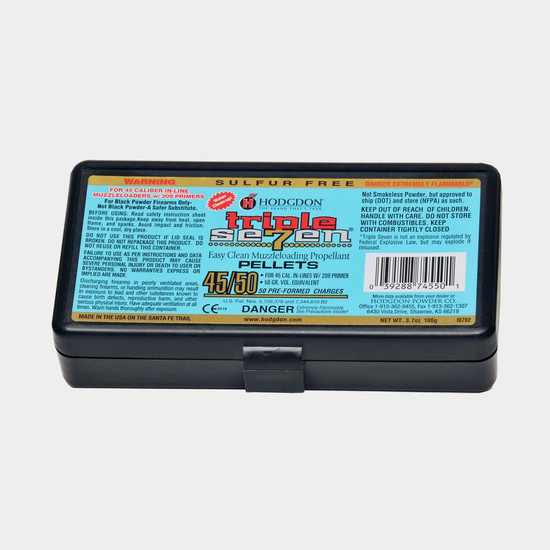 Triple Seven 45/50 Pellets are designed for in-line 45 caliber rifles. Clean-up is quick and easy with plain water. These pellets may be used in 45 caliber rifles with saboted 40 caliber bullets for game from squirrel to deer. Designed for use with 209 shotshell primers only.