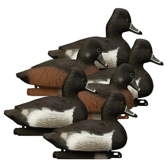 These Ringneck decoys feature deep, dark blacks, bright whites and rich, ruddy earth-tones. These decoys are lifelike, with deep feather carving and extra attention given to the eyes and to the bill details. This level of detail brings divers in from long distances, and finishes them up close. These decoys are extra wide, giving them more surface area for maximum visibility. Standard size decoys are slightly undersized from an average live duck, and are perfect for hunters looking for lightweight, packable, affordable decoys. Use them on their own, to pack in to your favorite public spot, or to add numbers and variety to any spread. Self-righting, weighted keel for quick and easy set-up in any water depth. Higdon's innovative keel clip allows simple short stringing in shallow water. Higdon's highly detailed, proprietary UV painting process and deep realistic carving techniques highlight each individual feather and minimize unnatural glare, even when decoys are wet. Our paint won't peel or fade, so your decoys will look great season after season. Package includes: 4 Upright Drakes, and 2 Resting Hens. As a Ducks Unlimited Official Licensed Product, a percentage of your purchase will go toward wetland conservation.