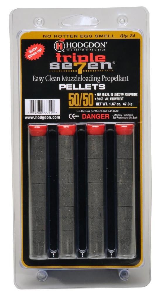 Triple Seven 50/50 pellets are 50-caliber, 50-grain pellets designed for use in 50-caliber, in-line rifles. A single pellet may be used for target or small game and two pellets may be used to create the 100 gr. equivalent for big game.