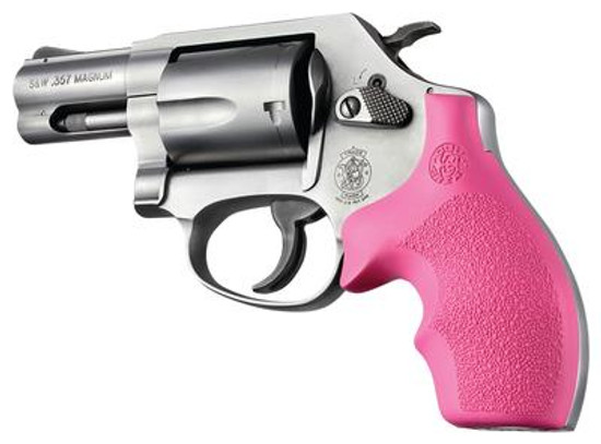 One-piece rubber grips for revolvers. Grips slide on the frame from the bottom, a special steel stirrup device clips over stockpin or bottom strap, grip screws to stirrup. Orthopedic handshape, ambidextrous palm swells and a generous recoil shoulder. Relieved for speed loaders. Cobblestone texture.
