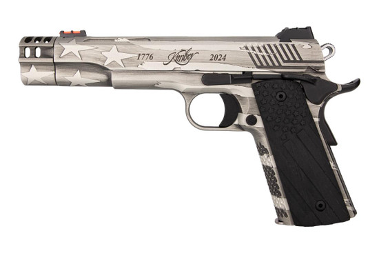 The Kimber Independence is Kimber's latest commemorative edition and the first compensated special edition. Featuring a patent-pending proprietary compensator, this limited edition Independence model is chambered in .45 Auto and is a testament to celebrating the July 4th holiday with a custom-tailored Cerakote finish. The Independence also features slide lightening cuts and a port along the forward top strap. Racing serrations at the rear of the slide are designed to mimic the flag's movement that adorns the entire pistol.