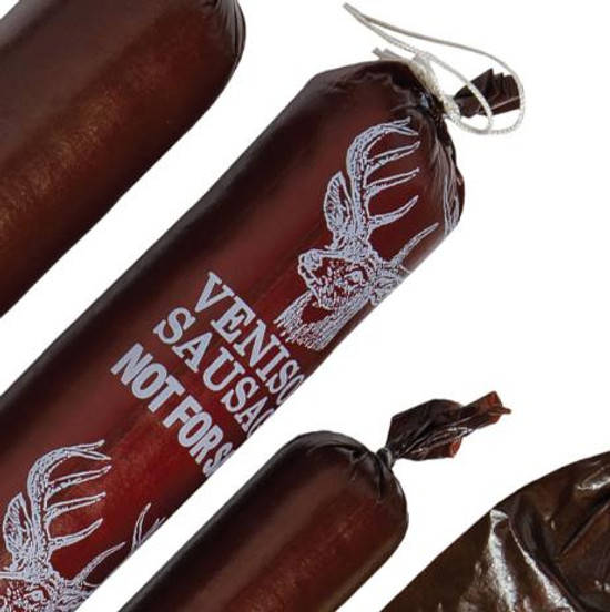 Fibrous casings are non-edible and string tied at one end. These fibrous casings are mahogany and printed with "Venison Sausage - Not for Sale". Fibrous casings allow moisture, air, and smoke to penetrate the casing, making it perfect for any type of bologna, cooked sausage, as well as dry (Genoa salami) or semi-dry sausage (summer sausage) and other cured sausages. Soak casings in warm water for 30 minutes prior to stuffing.