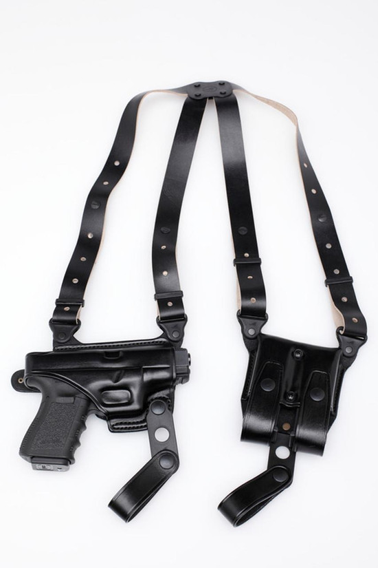 MASTER'S brand Leather Shoulder Holster Set with double magazine case. Custom molded by hand from heavy, top grain premium cowhide leather with beautiful stitching and first class craftsmanship.
