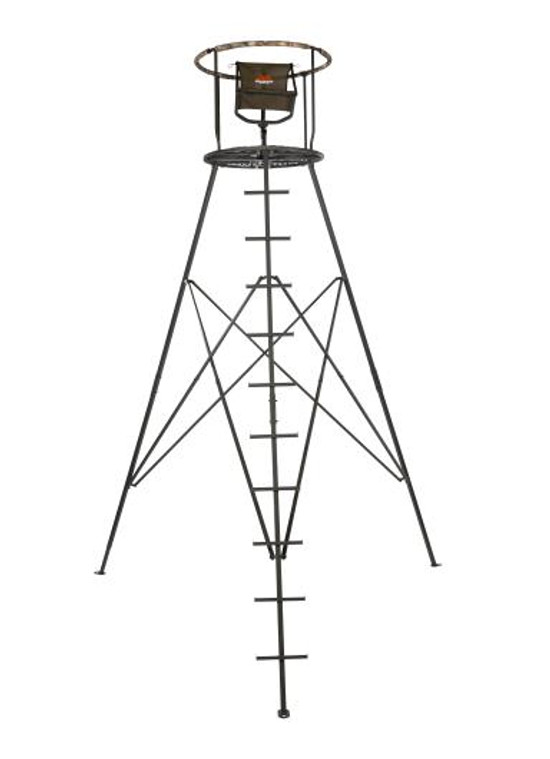 FEATURES Part of the "Revolution Series" offered by Millennium Steel Construction with powder coat finish Includes padded shooting rail and camo skirt with two gear pockets 16 feet to shooting rail Adjustable leg for uneven terrain Lift up 360 degree seat Seat..