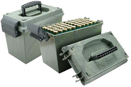 The SD-100 shotshell dry boxes hold 100 shotshells in two removable trays. The lid has an O-Ring design for water-resistant sealing and is removable for a less space needed in the hunting blind. This tough box has a generously-proportioned fold-down handle for transport and large latch for easy opening. The 20-gauge model holds shells up to 3 inches. Shotshell Dry Box is finsihed in MTM's green Wild Camo.
