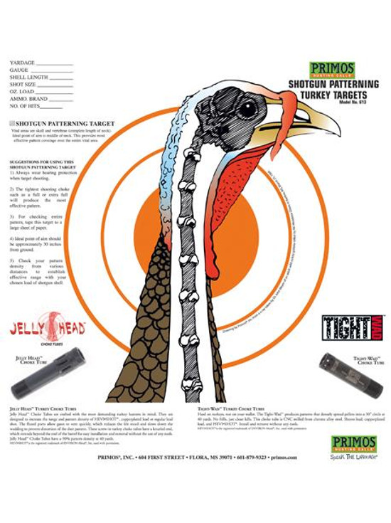 Don't aim at the head! Half of your pattern will pass above the gobbler. The proper point of aim is at the middle of the neck to ensure that the entire pattern covers the best kill zone of a turkey. The 10.75 x 11.5 surface of these targets show the most effective shot placement with a bright orange bulls-eye. You can see an actual X-ray of a turkey's head.