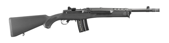 Garand Style action with breechbolt locking system, fixed-piston gas system and self-cleaning moving gas cylinder. Compact hammer-forged barrel with flash suppressor. Ghost ring adjustable rear aperture sight and protected, non-glare post front sight. Integral scope mount machined directly on the solid steel receiver. Receiver is drilled and tapped for mounting included picatinny rail and comes with scope rings. Black synthetic stock.