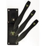 Double Edge Spear Point 3pc Set of Throwing Knives, 420J2 stainless 3mm rolled steel stock with reflective blade coating and ballistic web nylon sheath. Each knife 9", boxed.