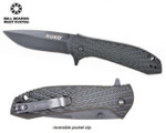 Stainless steel blade with flipper guard, locking liner design, non-slip rubberized & anodized aluminum handle, low profile reversible pocket clip, thumb stud opening, blade: 3-1/2" closed: 4-1/2", boxed