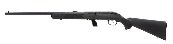 Detachable box magazine with ten round capacity. Black synthetic stock with cut checkering. Open sights; drilled and tapped for scope mounts. Blued carbon steel barrel with satin finish.