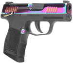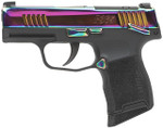 The P365-380 Rainbow features rainbow titanium finished slide, magazine catch, manual safety, slide catch, X-Series modular polymer grip and takedown lever. The slide includes a removable sight plate, XRay3 Day/Night sights in rear dovetail configuration, compatible with all RomeZero Optics as well as the RMS-C footprint. Includes a 10rd flush fit magazine and a 10rd extended magazine.