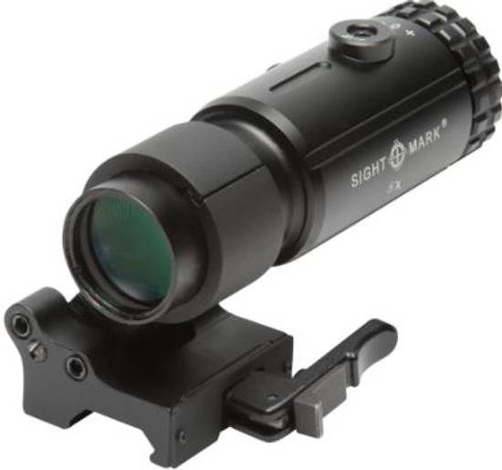 Built for shooting versatility, the Sightmark T-5 is a magnifier that mounts behind a reflex sight or red dot and provides an absolute co-witness. Instantly change the magnification of your close-range optic from 1x to 5x by using the T-5's flip-to-side mount. The magnifier's streamlined, low drag design prevents it from snagging on clothing and equipment and makes the T-5 .7" shorter than the magnifier it's replacing. Ideal for stretching your AR engagements out to 200 yards, an included LQD mount allows for rapid attaching/detaching in intense shooting situations. The T-5's aluminum construction is shockproof up to .308 caliber rifles and provides IP55 water resistant protection. Brightness and resolution are improved from fully multi-coated optics and external windage and elevation adjustments help shooters align the reticle of their red dot/reflex sight to the center of the magnifier's point of view. The Sightmark T-5 includes flip-to-side LQD mount, adjustment tools and manual.