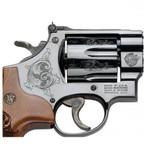 Smith & Wesson J-Frame revolver is designed to fire a full power round and is as simple and easy to use as it is reliable. The Model 29 Machine Engraved features scroll engraving on the frame, cylinder, and barrel with an engraved wood grip. It has a pinned red ramp front sight and micro adjustable rear sight. This model has a blued metal finish and includes a wooden mahogany presentation case.