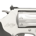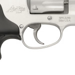 Single action/double action. Small J-frame. Eight round capacity. .240 inch semi-target hammer. .312 inch smooth target trigger. Light gathering Hi-Viz green dot front sight. Adjustable v-notch rear sight. Synthetic grips. Aluminum alloy frame and cylinder. Matte silver finish.