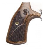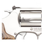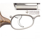 Chamfered charge holes. Pinned ramp with night sight. Ergonomic high-hand hold oversized laminate wood grip. Single/double action. Small frame. Exposed hammer. One piece barrel. Front sight: night sight. Rear sight: adjustable. Stainless frame and stainless cylinder.