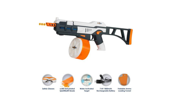 SplatRBall everything in your path with full auto 11 round per second water bead fire rate and a 1,200 round drum magazine! The SplatRBall SRB1200 Full Auto Water Bead Gel Ball Blaster shoots up to 210 feet per second (fps) SplatRBall ammo. It has a drum magazine with 1,200 round capacity. Shoots Certified 7.5mm SplatRBall water bead ammo at 11 rounds per second fire rate. It has an integrated LED blue light up bar on both sides! This kit contains one Blaster, 1,200 round drum magazine, detachable stock, 6,000 rounds of SplatRBalls, rechargeable 7.4V 1800mAh battery with charging cable (up to 5,000 shots per battery charge), SplatRBall collapsible funnel for magazine quick loading, safety glasses and one water activated target. Please make sure you only use SplatRBall Certified Ammunition . Other brands or types of ammo might damage your blaster.image