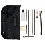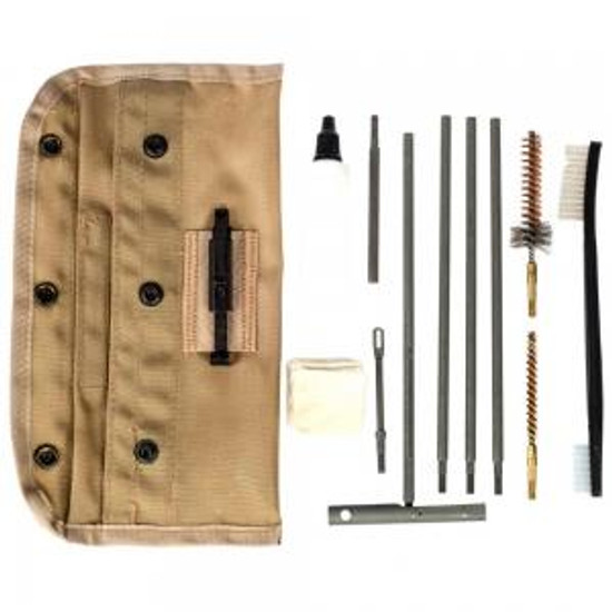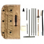 This standard USGI style cleaning kit is for the M16/M4 issue rifle. Rugged nylon pouch, strong snaps and ALICE clip is for easy carry and attachment. The military coated steel rods screw together for several different lengths for cleaning many weapons. You get a Military coated steel T-Handle rod, extensions rods, patch holder, brass bore brush, chamber brush, double ended nylon brush and oil bottle.
