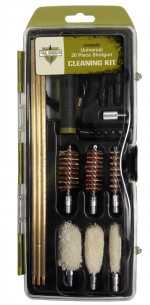 The Universal Shotgun 20pc Cleaning Kit comes with the brass cleaning rod, pull-through cable, six piece bit set and a thread adapter for the cleaning rods. The bore brushes and mops for 12 gauge, 20 gauge and .410 as well as 25 cleaning patches are included.