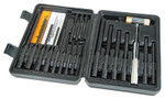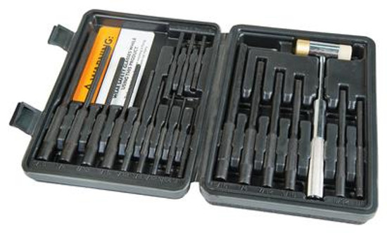 Combination of the Roll Pin Starter Set and the Ball Profile Roll Pin Punch Set into one comprehensive set. Nine piece punch set includes: 5/16, 1/4, 7/32, 3/16, 5/32, 1/8, 3/32, 5/64, 1/16 inch. Knurled handles. Nine piece roll pin set of same sizes. Includes small hammer, steel head for metal punches and surfaces, brass head for preventing marring.